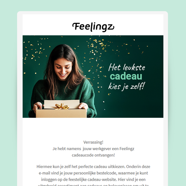 Wil je de bestelcodes liever digitaal versturen? Geen probleem! Wij sturen de medewerkers op de door jullie gewenste datum een mailing toe, inclusief een voorwoord en logo van jullie organisatie.